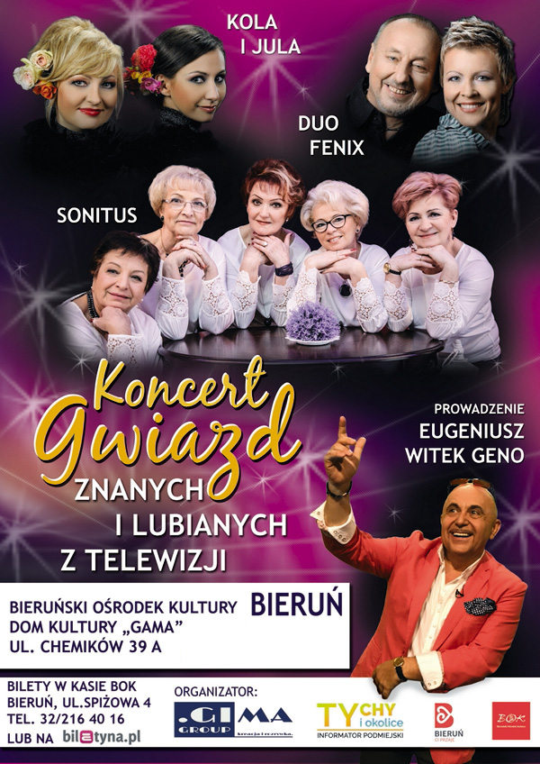 Zapraszamy serdecznie na Koncert Gwiazd znanych i lubianych z Telewizji, który przeniesie Państwa w świat pięknej muzyki, magii i niepowtarzalnych wrażeń. W tą podróż zabiorą Państwo znani artyści z telewizji i rozgłośni radiowych, a całość koncertu poprowadzi dla Państwa doskonale prezenter radiowy i telewizyjny Eugeniusz Witek Geno.