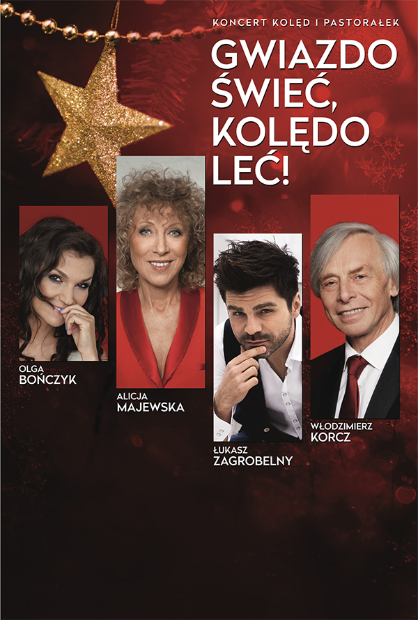 GWIAZDO ŚWIEĆ, KOLĘDO LEĆ - muzyczna podróż do krainy najpiękniejszych polskich kolęd i pastorałek w wykonaniu Alicji Majewskiej, Olgi Bończyk, Łukasza Zagrobelnego i Włodzimierza Korcza. Świąteczny koncert pełen radości, optymizmu, w którym każdy znajdzie dla siebie nutkę refleksji. Poza tradycyjnymi, znanymi wszystkim utworami, takimi jak "Dzisiaj w Betlejem", "Bracia patrzcie jeno", czy "Pójdźmy wszyscy do stajenki", w programie zabrzmią przebojowe kompozycje Włodzimierza Korcza z tekstami Wojciecha Młynarskiego, Magdy Czapińskiej, Wojciecha Kejne oraz Ernesta Brylla, wszystkie w brawurowych, trzygłosowych opracowaniach.