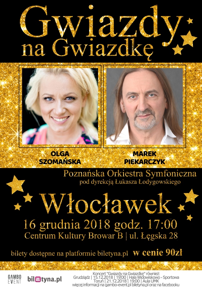 Koncert "Gwiazdy na Gwiazdkę" to niepowtarzalna okazja, by czas oczekiwania na Święta Bożego Narodzenia umilić dźwiękami muzyki! Wspaniali wykonawcy Olga Szomańska i Marek Piekarczyk wraz z Poznańską Orkiestrą Symfoniczną przeniosą Publiczność w świąteczny klimat.