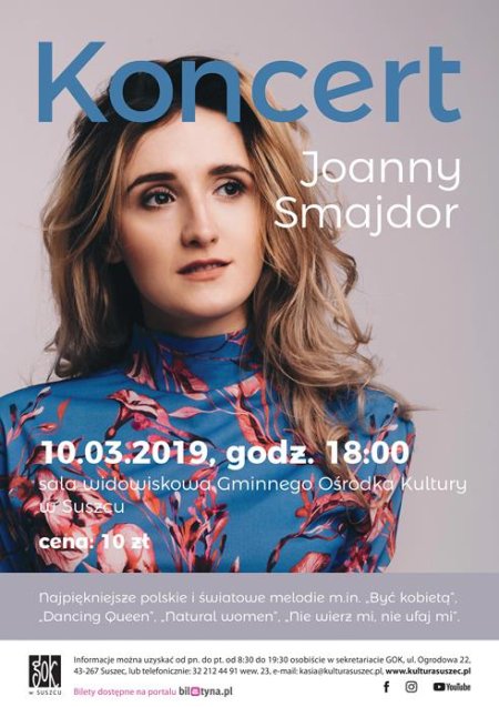 Koncert odbędzie się 10 marca 2019 o godz. 18:00 w sali widowiskowej Gminnego Ośrodka Kultury w Suszcu.