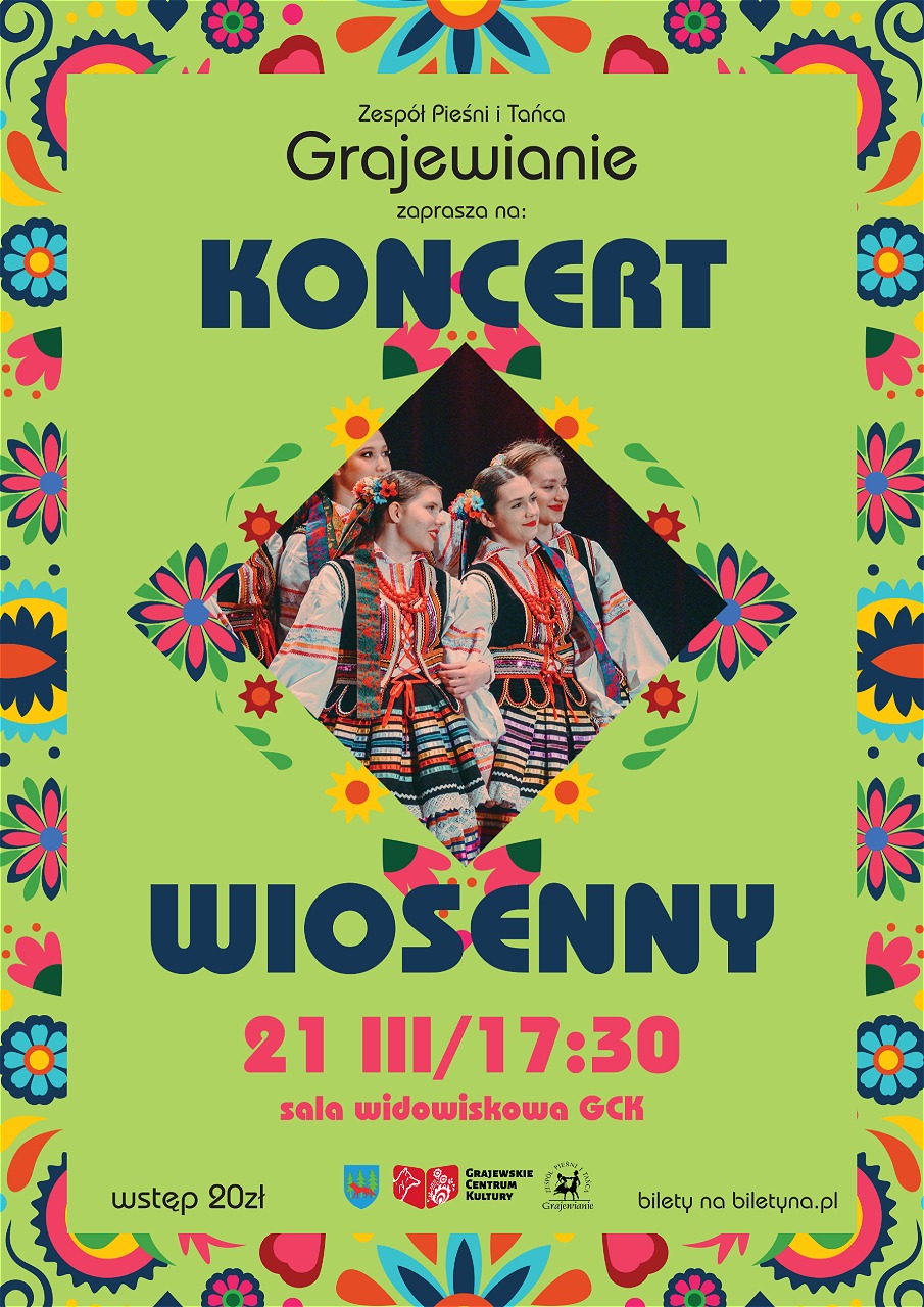 Zapraszamy na Koncert Wiosenny ZPiT „Grajewianie”, jak zwykle nie zabraknie wrażeń artystycznych i tańców z różnych stron polski w wykonaniu wszystkich grup wiekowych zespołu.