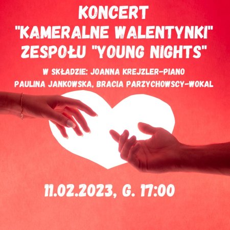 Zapraszamy na koncert pt. "Kameralne Walentynki" w wykonaniu zespołu "Young Nights" w składzie: Paulina Jankowska i Bracia Parzychowscy- wokal, Joanna Krejzler- piano. Będzie to okazja do posłuchania znanych i lubianych piosenek-nie tylko o miłości. W klimatycznej, oświetlonej blaskiem świec sali, młodzi wokaliści wprowadzą gości w walentynkowy nastrój. Niespodzianką będą premierowe utwory.