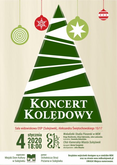 Koncert Kolędowy odbędzie się w dniu 04.01.2020 r. o godzinie 18:00 w sali widowiskowej OSP w Sulejówku, ul. Aleksandra Świętochowskiego 15/17.