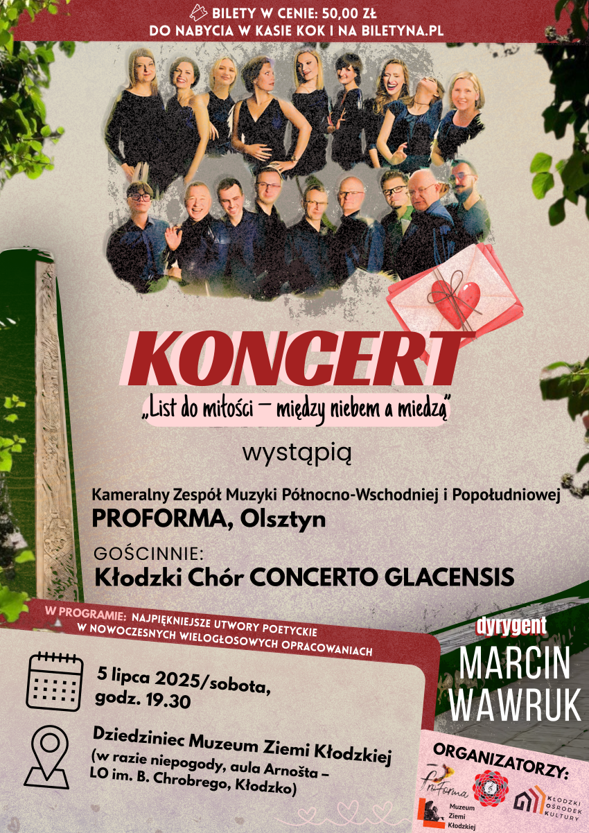Zapraszamy Państwa do odbycia wspólnej podróży sentymentalnej, w której motywy ludowe, utwory poetyckie i piosenki, zaczerpnięte ze skarbnicy zbiorowej pamięci Polaków, zespół wokalny „ProForma“ opowie na nowo we własnych, autorskich opracowaniach. Program „Między niebem a miedzą” jest oparty na bliskiej sercu tradycji muzycznej Rzeczypospolitej, tej dawniejszej i tej całkiem nieodległej, która niezmiennie pozostaje wdzięcznym źródłem inspiracji do twórczych działań. Zespół ProForma prezentuje polską muzykę rozrywkową i tradycyjną w nowoczesnych opracowaniach Marcina Wawruka. Słychać w nich często nietypowe brzmienia, efekty perkusyjne i inne techniki wokalne, poszerzające możliwości ekspresji muzycznej, łączące tradycję i nowoczesność w harmonijnym i inspirującym dialogu. Przypomnimy wielkie przeboje piosenki poetyckiej (Czesława Niemena, Marka Grechuty, Grzegorza Turnaua, zespołu „Skaldowie“ i in.), ale także pieśni polskiej tradycji, twórczość pieśniarską Stanisława Moniuszki oraz przedwojenne szlagiery polskiej muzyki filmowej, oprawione na nowo we współczesnej, wielogłosowej stylistyce. Na dziedzińcu Muzeum Ziemi Kłodzkiej spotkamy się z naszymi przyjaciółmi z kłodzkiego chóru kameralnego ”Concerto Glacensis”, by wspólnie wykonać dla Państwa utwory wybrane specjalnie na potrzeby tego koncertu.