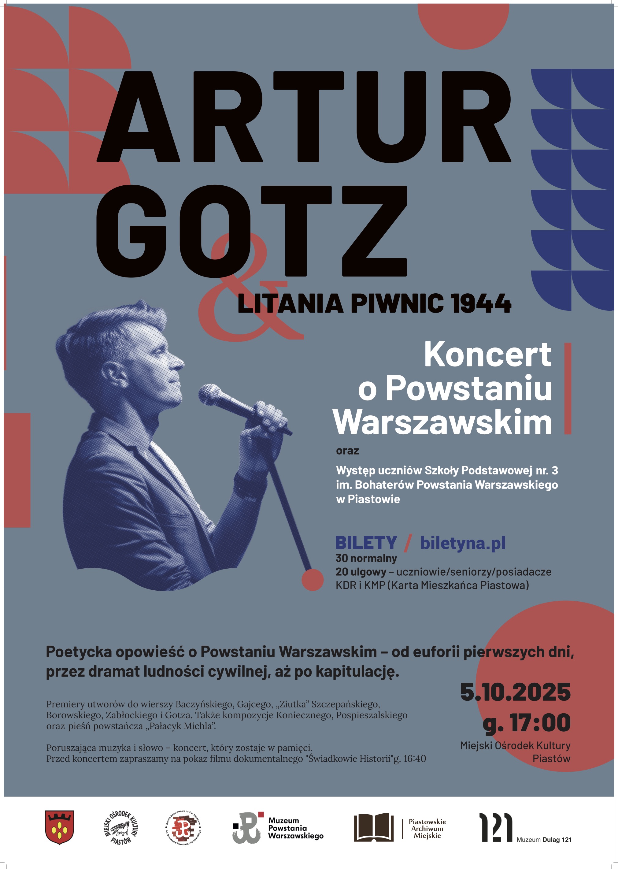 „Litania piwnic 1944” to koncert Artura Gotza, który został przygotowany z okazji 80. rocznicy wybuchu Powstania Warszawskiego. Jest to poetycka opowieść o Powstaniu od wielkiej euforii na początku sierpnia, aż do przerażenia ludności cywilnej. Wykorzystane zostały opisy nalotów samolotów i spadania bomb oraz makabryczne obrazy ukrywania się ludności w piwnicach, a także dzień kapitulacji, czyli 2 października. W warstwie muzycznej wykorzystane zostały współczesne aranżacje, a prostota formy znakomicie uwydatnia siłę poetyckiej treści. Z tego niezwykłego spotkania z pewnością nikt nie wyjdzie obojętny. Do tej tragicznej historii nawiązują premierowe kompozycje Artura Gotza do wierszy Krzysztofa Kamila Baczyńskiego („Wiatr”), Tadeusza Gajcego („Ponad nocą”), Józefa „Ziutka” Szczepańskiego („A gdy będzie już po wojnie”), Tadeusza Borowskiego („Ani wiersz, ani proza”) i współczesnych tekstów: Michała Zabłockiego, które opisuje zdobycie PAST-y oraz Artura Gotza („Zbliża się Godzina W.”). Na liście utworów znajdują się również dwie kompozycje Zygmunta Koniecznego, z którym Gotz rozpoczął współpracę w Piwnicy pod Baranami. Jest to m.in. wyjątkowa kompilacja wierszy Czesława Miłosza i Krzysztofa Kamila Baczyńskiego („Ty żyjący”) oraz kompozycje Mateusza Pospieszalskiego, z którym Artur Gotz współpracował podczas realizacji „Pamiętnika z Powstania Warszawskiego” Mirona Białoszewskiego w Teatrze Kamienica w Warszawie, a także oryginalna pieśń z czasów Powstania, czyli „Pałacyk Michla” Ziutka Szczepańskiego oraz utwór Grzegorza Tomczaka „Tango na głos”. Pomysłodawcą, reżyserem i głównym wykonawcą jest Artur Gotz – wokalista, który nagrał sześć płyt, zagrał ponad 700 koncertów w Polsce, Europie, USA, Australii, Nowej Zelandii i na Kubie, aktor scen Warszawy i Łodzi, tytułowy bohater powieści „Idol” Marty Fox, zafascynowany tematyką Powstania Warszawskiego. Zespół w składzie: Artur Gotz (wokal) Dawid Ludkiewicz (klawisze) Łukasz Jerzykowski (gitara basowa) Wojciech Bylica (perkusja) Michał Nowak (realizacja dźwięku) Przed koncertem, o godz. 16:40, zapraszamy na: Pokaz filmu dokumentalnego „Świadkowie historii”, Występ uczniów Szkoły Podstawowej nr 3 im. Bohaterów Powstania Warszawskiego w Piastowie.