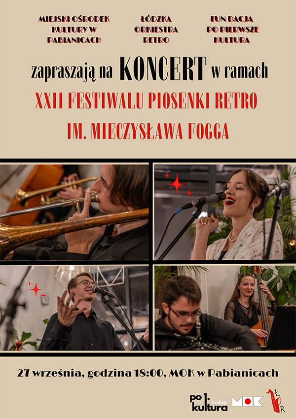 Łódzka Orkiestra Retro, Fundacja Po Pierwsze Kultura i Miejski Ośrodek Kultury w Pabianicach zapraszają na koncert będący swoistym wehikułem czasu. Zespół dziesięciu młodych muzyków, zafascynowanych muzyką lat dwudziestych i trzydziestych XX wieku przeniesie Państwa w czasy świetności kabaretów, kawiarni literackich i dancingów, gdzie muzyka łączyła pokolenia i niosła radość odzyskującej blask Polsce. W wykonaniu laureatów I miejsca w Konkursie Piosenki z Ulicy na Festiwalu Grzesiuka, publiczność usłyszy największe szlagiery tamtych lat, od Ali Baby, po Śląskie tango i Apaszem Stasiek był. Wydarzenie odbędzie się 27 września o godzinie 18:00 w Miejskim Ośrodku Kultury w Pabianicach, w ramach XXII Ogólnopolskiego Festiwalu Piosenki Retro im. Mieczysława Fogga.
