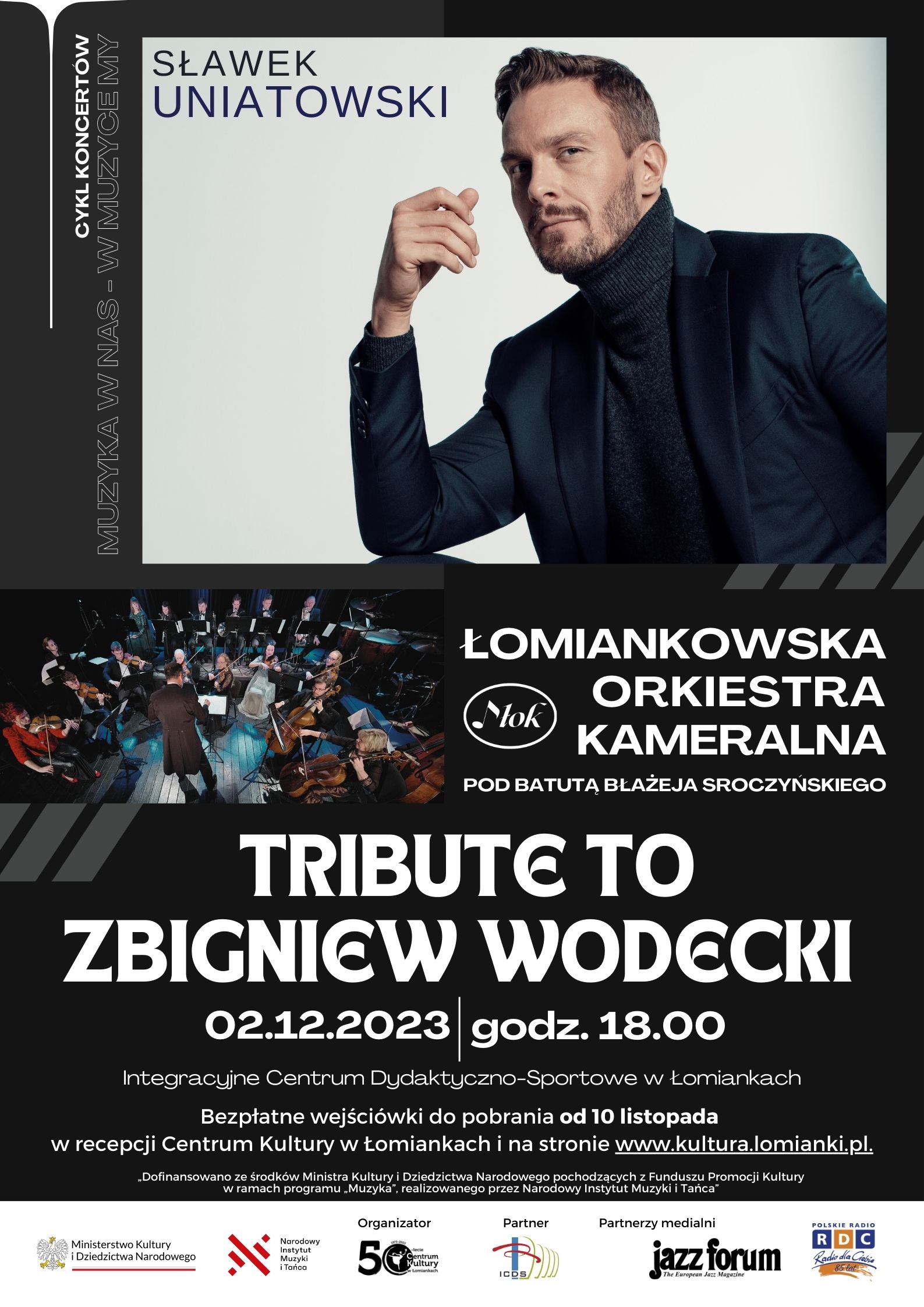 Bez wątpienia Zbigniew Wodecki należy do jednego z najwybitniejszych kompozytorów, piosenkarzy i multiinstrumentalistów. Łomiankowska Orkiestra Kameralna niejednokrotnie wykonywała jego najpiękniejsze piosenki, ale zaplanowany na sobotni wieczór 2 grudnia koncert będzie należał do wyjątkowych. „Tribute to Zbigniew Wodecki”, bo tak zatytułowane jest grudniowe wydarzenie, to swoiste oddanie hołdu twórczości Zbigniewa Wodeckiego. Łomiankowska Orkiestra Kameralna pod batutą Błażeja Sroczyńskiego zaprezentuje znane piosenki kompozytora, będące zapisane na stałe ścisłej czołówce najpopularniejszych utworów polskiej muzyki rozrywkowej. Wspólnie z muzykami orkiestry, gościnnie wystąpi wokalista, kompozytor i autor tekstów Sławek Uniatowski, którego głos elektryzuje kobiece serca i wywołuje pozytywne emocje wśród jego słuchaczy. Właśnie połączenie tych dwóch kwestii, głosu Sławka i twórczości Wodeckiego sprawi, że koncert dla jego uczestników będzie niezapomnianym muzycznym przeżyciem.