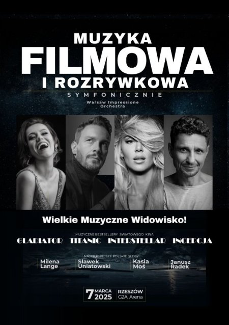 Koncert Muzyki Filmowej i Rozrywkowej Symfonicznie 🎶 na jednej z największych scen w Polsce – w G2A Arena w Rzeszowie! 💥 ✨ Wspaniali artyści: Kasia Moś, Sławek Uniatowski, Janusz Radek oraz Milena Lange! Kup bilety już teraz!