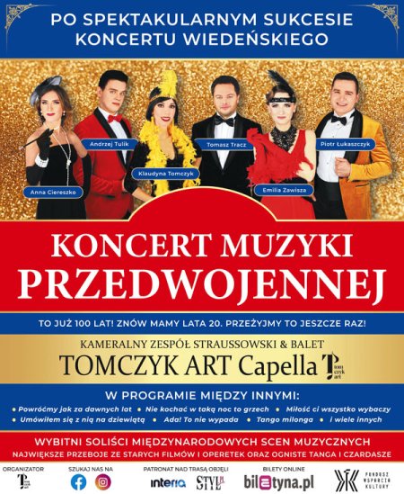 Po spektakularnym sukcesie Koncertu Wiedeńskiego agencja muzyczna Tomczyk Art ma zaszczyt zaprosić Państwa na premierę - Koncert Muzyki Przedwojennej. Minęło już 100 lat! Znów mamy lata 20. Przeżyjmy to jeszcze raz!