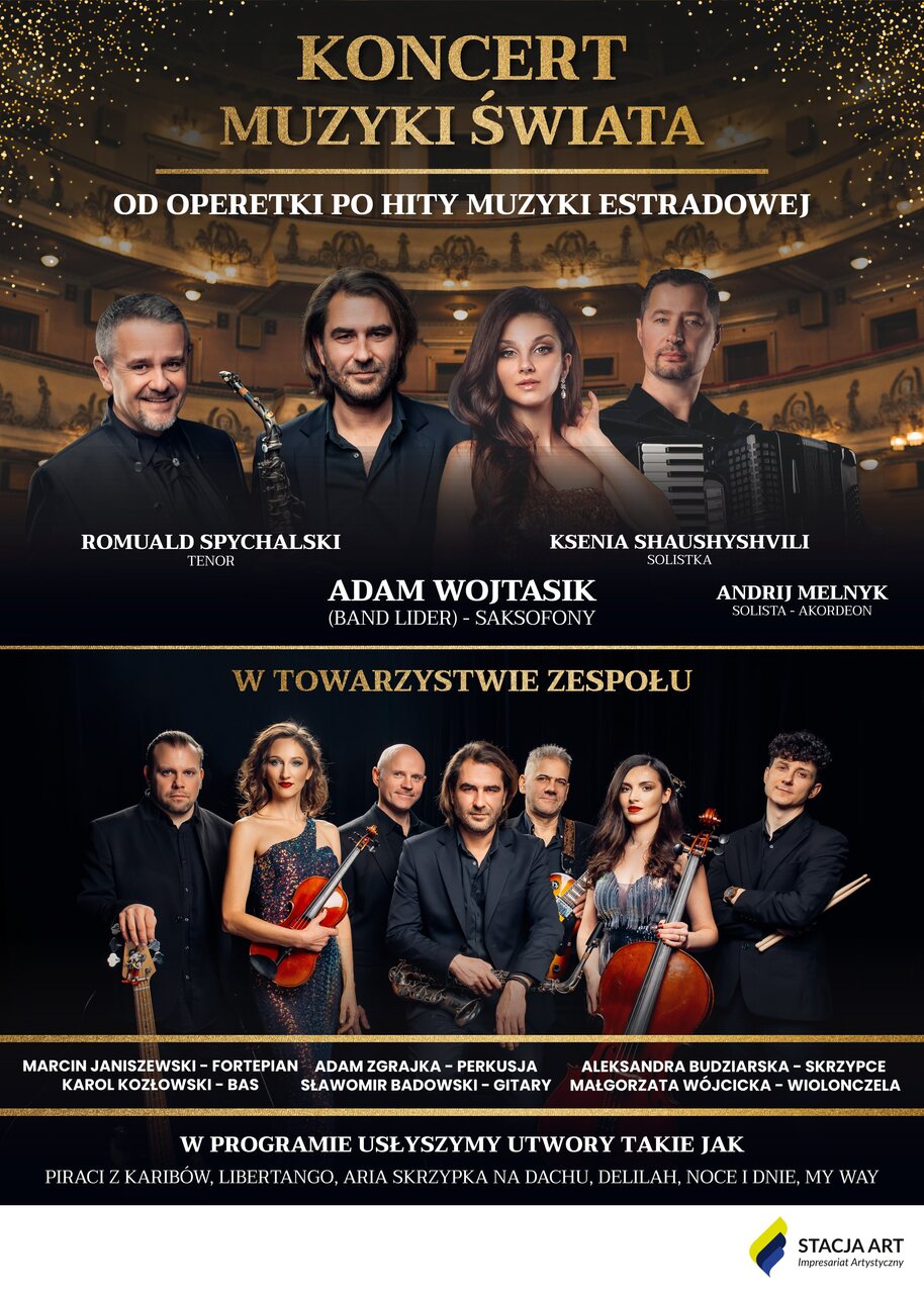 To kolejny z serii koncertów pod hasłem od Operetki po Hity Muzyki Estradowej. W tę muzyczną podróż zabierze Nas wyjątkowa, 10 osobowa grupa muzyków i solistów pochodząca z różnych krajów Europy. Doskonałe aranżacje , nieznane dotąd wersje znanych i uwielbianych utworów usłyszymy i zobaczymy na żywo !!! Artyści zaprezentują między innymi Libertango , Arie ze Skrzypka na dachu, muzykę z filmową "Piraci z Karaibów " Zapach Kobiety" ,07 zgłoś się. Ponad to piosenkę Francuską ( Edith Piaf ) ujmujące Ballady Gruzińskie jak i włoskie przeboje w wiązance Volare.Największe przeboje amerykańskich wykonawców i wiele innych, które pozostaną niespodzianką do dnia koncertu Czas : 110 min. plus bis
