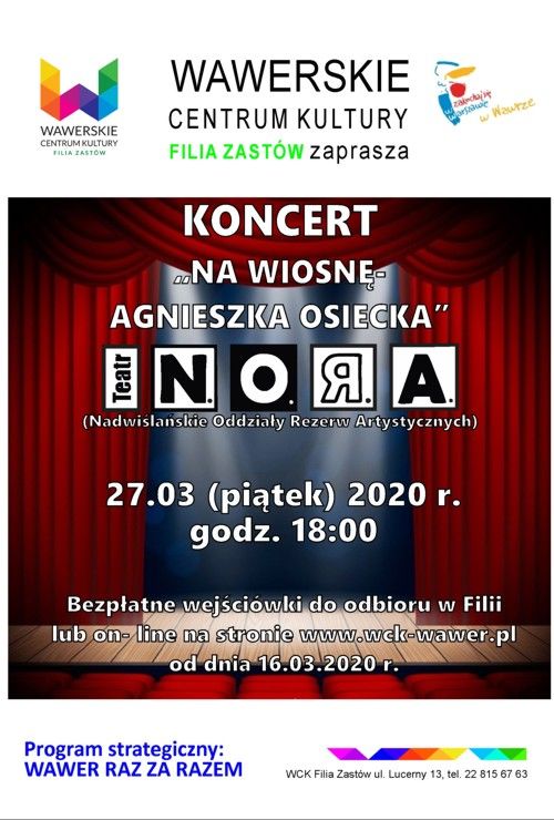 Koncert wokalistów teatru N.O.R.A. z piosenkami Agnieszki Osieckiej. Tej postaci nie trzeba bliżej przedstawiać- znakomita poetka, prozaik, autorka spektakli teatralnych i telewizyjnych, reżyser filmowy, dziennikarka, przede wszystkim jednak autorka ponad dwóch tysięcy tekstów piosenek. Jej utwory nuci każdy z nas i na pewno z przyjemnością posłucha ich w wykonaniu młodych wokalistów teatru N.O.R.A.