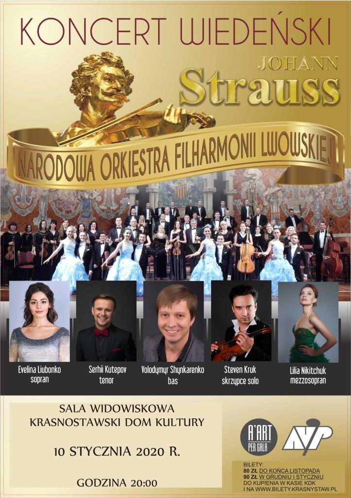 Zapraszamy Państwa w podróż do romantycznego i roztańczonego Wiednia, magicznego świata operetki, gdzie będą rozbrzmiewać najpiękniejsze arie, duety, walce i polki Johanna Straussa. Gdzie, w pełnych zachwytu dźwiękach, będzie można usłyszeć szelest długich sukien, huk rozlewanego szampana, czy miłosne westchnienia w alkowach. Wybitne kompozycje w wykonaniu Narodowej Orkiestry Filharmonii Lwowskiej oraz międzynarodowej klasy solistów sceny operetkowej, operowej i musicalowej, przeniosą słuchaczy do ojczyzny walca, polki, a także do Nowego Jorku, do Najsłynniejszej sceny musicalowej Broadwayu. Artyści zaprezentują niezwykły kunszt wokalny i wykreują dla Państwa najwspanialsze światowe arie, szlagiery i duety miłosne.