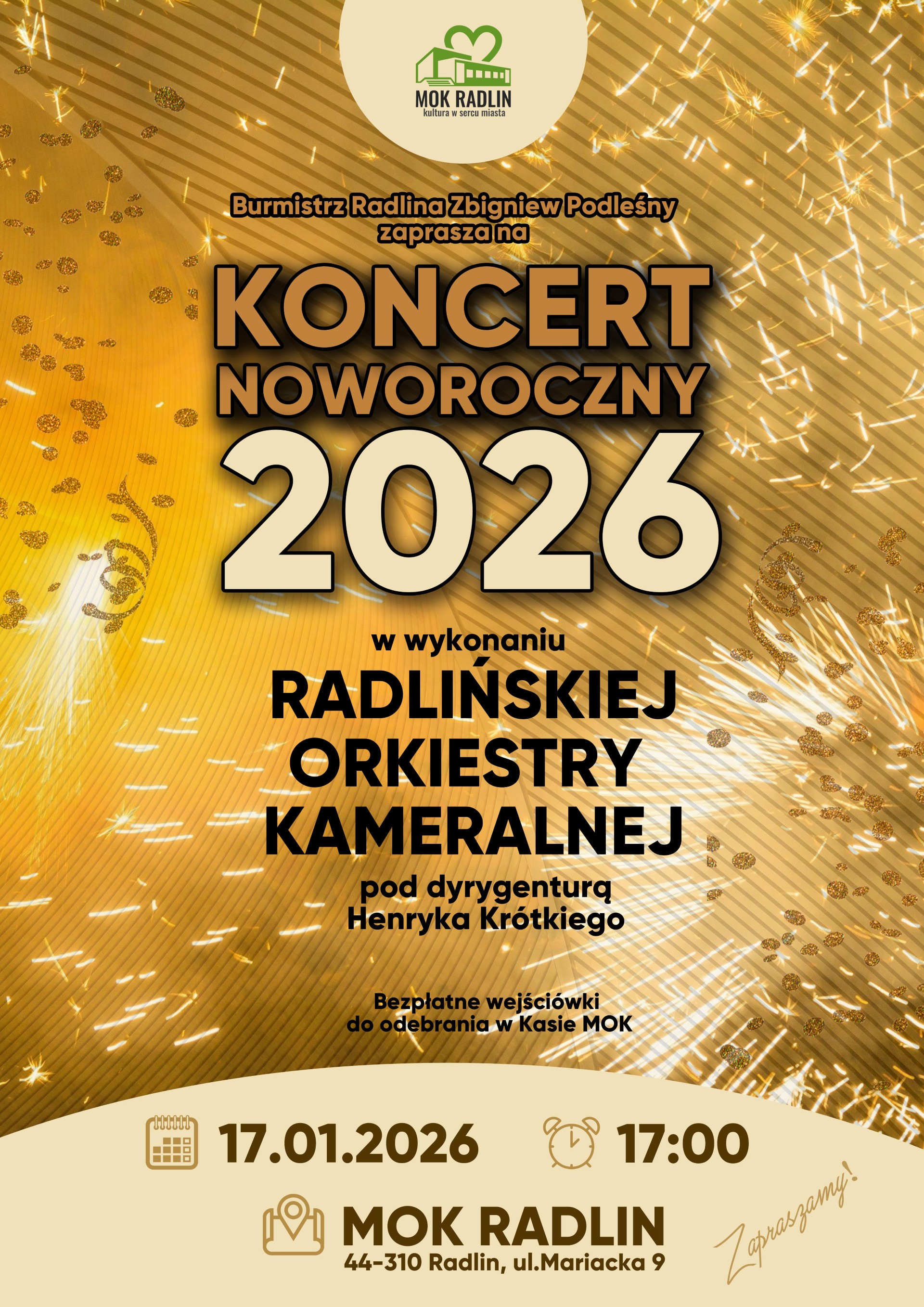 Zapraszamy na Koncert Noworoczny 2026 w wykonaniu Radlińskiej Orkiestry Kameralnej pod dyrygenturą Henryka Krótkiego. To wyjątkowe muzyczne spotkanie, pełne elegancji i noworocznej atmosfery, będzie doskonałą okazją do wspólnego rozpoczęcia roku przy dźwiękach klasyki i ulubionych utworów koncertowych.