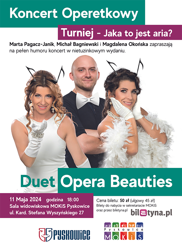 Koncert Operetkowy „Turniej – Jaka to jest aria?” poczęstuje Państwa solidną dawką muzycznego humoru. Na Waszych oczach rozegra się turniej o miano Królowej Arii. O ten zaszczytny tytuł konkurować będą dwie urocze sopranistki: Marta Pagacz-Janik i Magdalena Okońska. Turniej prowadzić będzie tenor Michał Bagniewski, a konkurs rozstrzygnie… publiczność!
