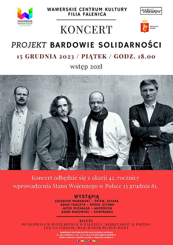 Projekt BARDOWIE SOLIDARNOŚCI wystąpi w WCK Filii Falenica w składzie: Adam Tkaczyk – śpiew i gitara, Zbigniew Murawski – śpiew i gitara, Jacek Michalak – akordeon, Adam Rakowski - kontrabas. Koncert odbędzie się z okazji 42 rocznicy wprowadzenia stanu wojennego. Zabrzmią najważniejsze pieśni i piosenki tamtego okresu, nazywane hymnami Solidarności: Mury, Modlitwa o wschodzie słońca, Piosenka dla córki, Pieśń o śnie i inne.