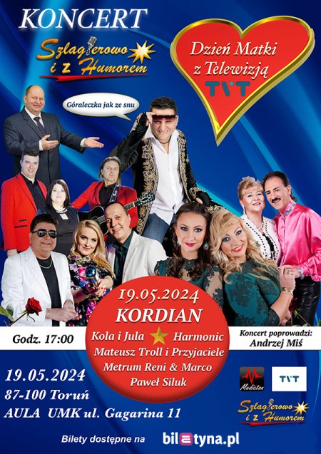 WYJĄTKOWY KONCERT Z OKAZJI DNIA MATKI - Szlagierowo i z Humorem w Toruniu!!! Kto z nas nie kocha swojej Mamy bez względu na to ile mamy lat. Mama to jedna z najważniejszych osób w naszym życiu - ta, która kocha najmocniej i zna nas najlepiej. Z ogromną przyjemnością Zapraszamy Państwa na Koncert - Dzień Matki - Szlagierowo i z Humorem, który odbędzie się 19.05.2024 o godz. 17:00 w Auli UMK ul. Jurija Gagarina 11, 87-100 Toruń. O dobry humor i mnóstwo szlagierowej muzyki zadbają znani Wykonawcy z wielu Stacji Telewizyjnych, oraz rozgłośni Radiowych na Śląsku i nie tylko. Wystąpią: Kordian - zwany Królem Folk Polo, Kola i Jula, zespół Harmonic, Mateusz Troll i Przyjaciele, Metrum Reni & Marco, Paweł Siluk Steiner. Trzy godziny Niesamowitego Show Szlagierowo i z Humorem poprowadzi - Andrzej Miś!!! Serdecznie Zapraszamy!!!