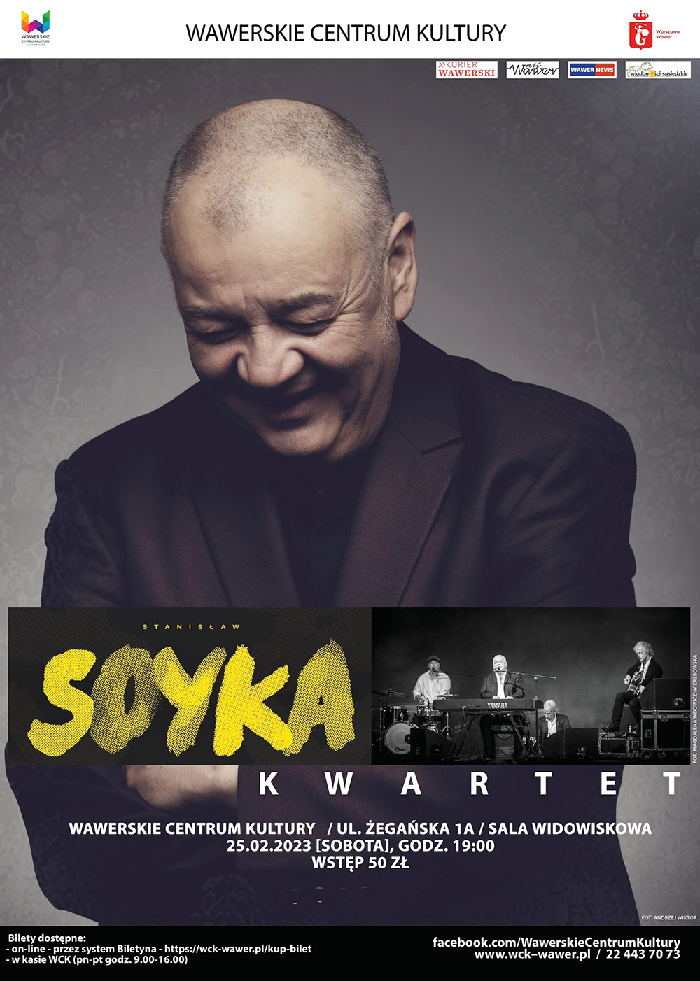 Tym razem wystąpi z zespołem SOYKA KWARTET. Towarzyszyć mu będą Przemek Greger na gitarze akustycznej, syn Kuba na perkusji oraz Zbyszek Brysiak na perkusjonaliach. SOYKA KWARTET stanowi bogatą i niebywale ciekawą paletę kolorystyczną a jazzowe temperamenty i kompetencje wyzwalają podczas nagrań i w czasie koncertów tę unikalną moc muzyki improwizowanej.