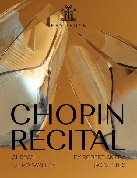 Zapraszamy Państwa na Koncert Sylwestrowy z muzyką Fryderyka Chopina. Recital wykona dla Państwa Robert Skiera, wybitny polski pianista i kameralista, absolwent Warszawskiego Uniwersytetu Muzycznego w 1988 roku w klasie fortepianu Alicji Palety-Bugaj i klasie kameralistyki Barbary Halskiej.