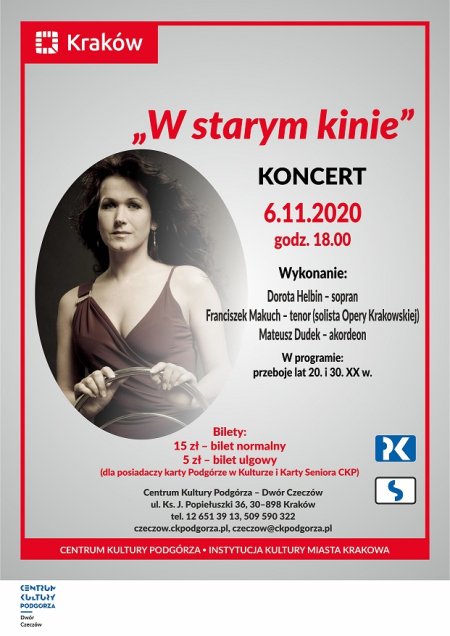 Zapraszamy serdecznie na listopadowy koncert pt. "W starym kinie", który odbędzie się 6 listopada o godzinie 18:00 w sali balowej Dworu Czeczów.