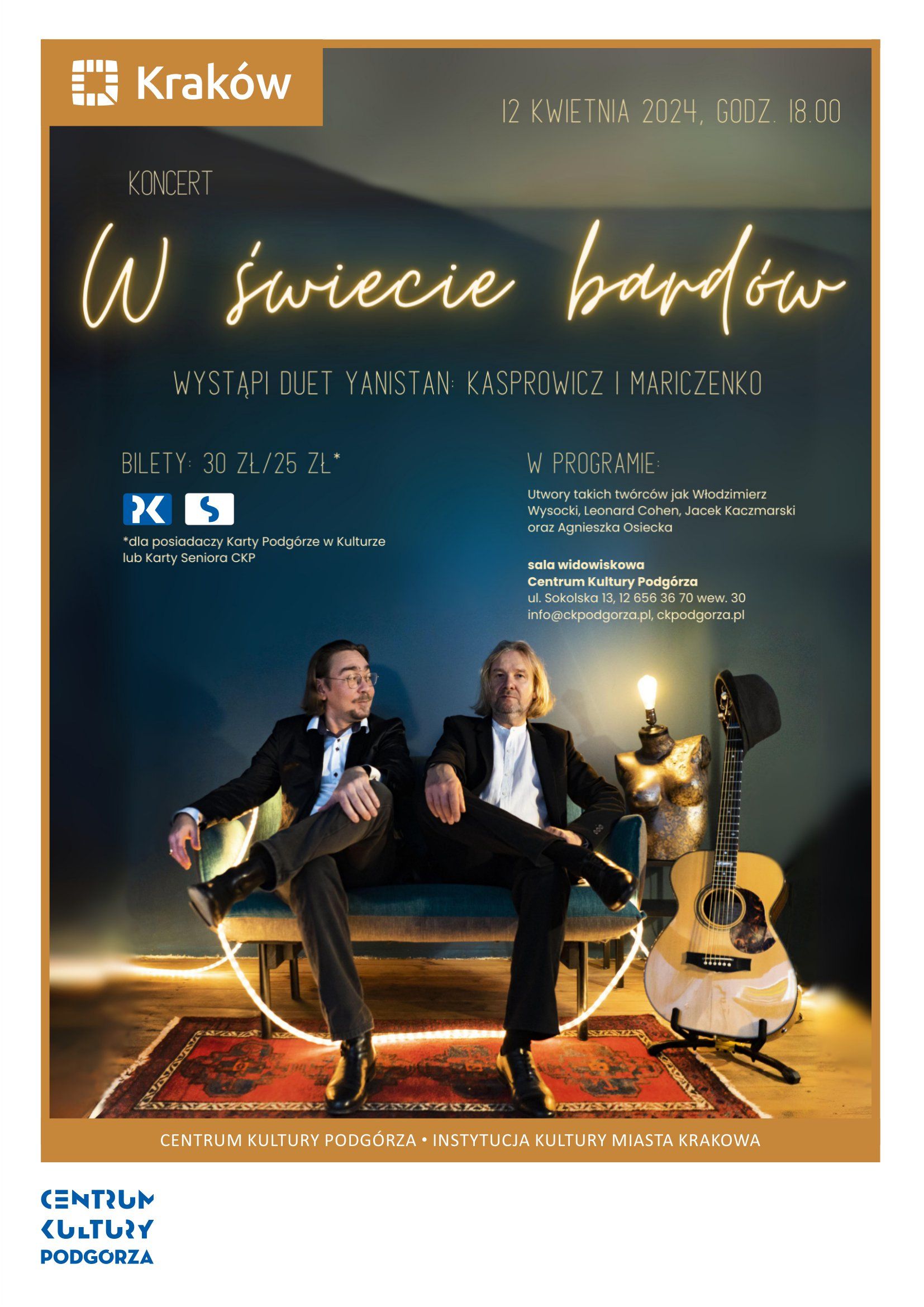 Podczas koncertu duet wykona utwory takich wybitnych twórców jak m.in.: Włodzimierz Wysocki, Leonard Cohen, Jacek Kaczmarski oraz Agnieszka Osiecka.