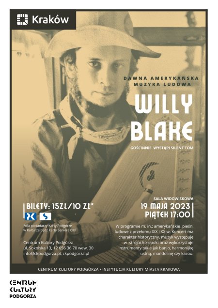Willy Blake to wykonawca zagra je w oryginalnych aranżacjach i unikalnych tonacjach, różnymi, często zapomnianymi stylami, o których krótko krótko opowie. Zagra na gitarze akustycznej, akustycznej dwunastostrunowej, mandolinie, banjo, autoharpie oraz skrzypcach, wzbogacając wszystko harmonijkami ustnymi i quills.