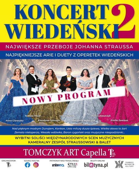 Wzruszają i bawią publikę od wielu lat, za każdym razem przyjmowani owacjami na stojąco! Tradycją stały się już coroczne Koncerty Wiedeńskie w wykonaniu tej niezwykłej grupy wspaniałych artystów. To połączenie klasycznej wiedeńskiej formy i kunsztu z młodością, wdziękiem, werwą i niespotykaną muzykalnością artystów wykonujących to jedyne w swoim rodzaju widowisko. Zabrzmią największe, ponadczasowe i wiecznie bliskie sercom melomanów przeboje króla walca - Johanna Straussa, nie zabraknie także popisowych arii z najsłynniejszych operetek "Zemsta nietoperza", "Baron cygański", "Wesoła wdówka", "Księżniczka czardasza" oraz "Kraina uśmiechu". Publiczność usłyszy m.in.: Walc "Nad pięknym modrym Dunajem", Arię Barinkaya "Wielka sława to żart", Duet wszech czasów "Usta milczą dusza śpiewa", polkę "Tritsch- Tratsch" oraz słynny "Marsz Radeckiego". Koncert programowo nawiązywać będzie do tradycyjnych gali i noworocznych koncertów, odbywających się w Wiedniu.