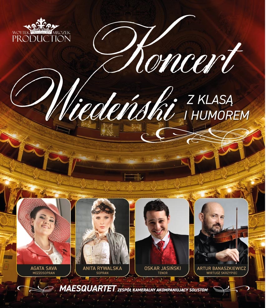 Anita Rywalska – sopranistka, absolwentka Akademii Muzycznej w Gdańsku, którą ukończyła z wyróżnieniem. W jej repertuarze znajdują się m.in. pieśni F. Schuberta, R. Schumanna, F.Poulenca, utwory oratoryjno – kantatowe oraz partie operowe i operetkowe: Santuzzy w Cavalleria Rusticana P. Mascagniego, tytułowa rola w Carmen G. Bizeta, Catherine w operze O żonie niemej T. Kasserna (prapremiera światowa). Niezwykle utalentowana śpiewaczka jest gwiazdą „Akademii Humoru” – programu telewizyjnego Waldemara Malickiego. Agata Sava - wybitna polska mezzosopranistka, solistka opery w Pradze. Absolwentka Hohschule fur Musik w Monachium, którą ukończyła z wyróżnieniem, a także stypendystka dwóch prestiżowych grantów: DAAB - Dwuletniego Stypendium Rządu Niemiec oraz Yehudi Menuhin Live Music Now. Koncertuje aktywnie na scenach całego świata, m.in.: Chicago Philharmonic Hall, Filharmonii Narodowej w Warszawie, czy Lucerne Concert Hall, oraz w Filharmonii w Zurychu i Genewie, gdzie występowała z Chicago Sinfonietta. Jej pięknego głosu można było posłuchać także w trakcie wystepów w prestiżowych salach koncertowych Japonii. Oskar Jasiński - niezwykle charyzmatyczny i pełen humoru polski tenor. Absolwent Wydziału Wokalno-Aktorskiego Akademii Muzycznej w Katowicach. Laureat międzynarodowych konkursów wokalnych. Na co dzień, solista Śląskiej Operetki Kameralnej, aktywnie współpracuje z wieloma polskimi orkiestrami i filharmoniami, a także operą śląską i krakowską. Bierze udział w wielu produkcjach i projektach muzycznych w całej Polsce, a także z wielką klasą i humorem prowadzi koncerty operetkowe, operowe, musikalowe i inne. Artur Banaszkiewicz - skrzypek, kompozytor, aranżer. Oprócz klasycznego repertuaru skrzypcowego artysta często prezentuje publiczności własne, wirtuozowskie fantazje i parafrazy znanych, utworów z różnych obszarów muzyki, m.in.: Viva Strauss!, La Fiesta Mexicana, Skrzypek na Dachu, Hava Nagilah, Oczy czarne, Kalinka. Autorski koncert Wieczór w krainie Czardasza, inspirowany cygańskim i żydowskim folklorem, otworzył mu drzwi wielu prestiżowych sal koncertowych świata, m.in. Lincoln Center w Nowym Jorku, Berlińskiej Filharmonii czy Lipskiego Gewandhaus.