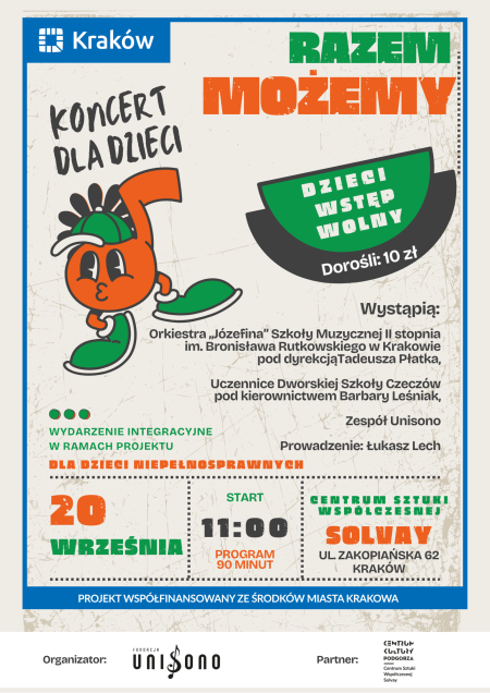 Już w najbliższą sobotę 20 września o godzinie 11:00 na sali widowiskowej Centrum Sztuki Współczesnej Solvay odbędzie się wyjątkowe wydarzenie organizowane przez Fundację Unisono: KONCERT DLA DZIECI ”Razem Możemy”.