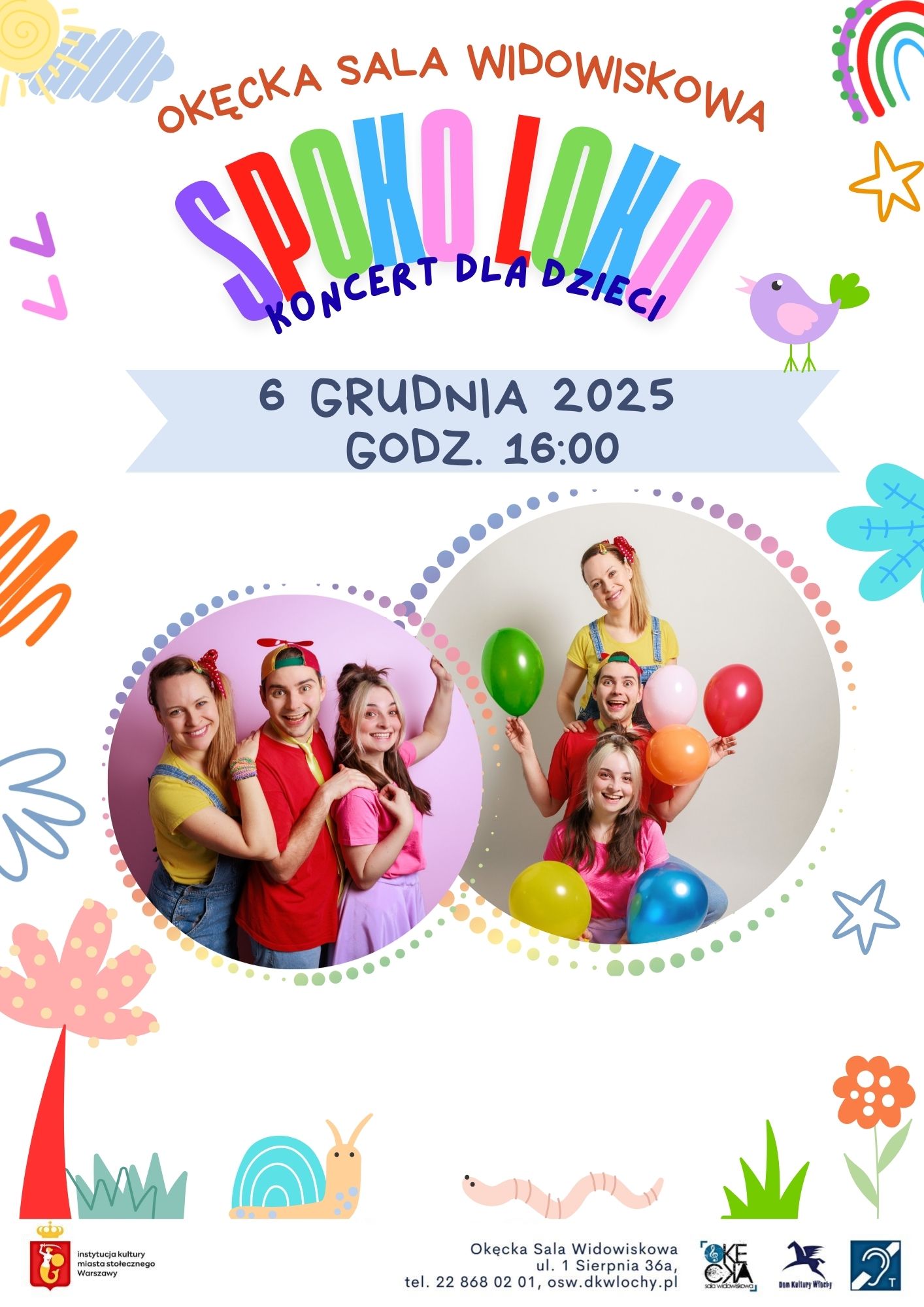Spoko Loko – jeden z najpopularniejszych zespołów muzycznych dla najmłodszych w Polsce – wystąpi na scenie Okęckiej Sali Widowiskowej. Kasia, Karolina i Mati zabiorą dzieci w kolorowy świat muzyki, ruchu i uśmiechu, prezentując największe hity, które pokochały miliony małych fanów – m.in. „Tańce Połamańce” i „Ciu Ciu ła”.