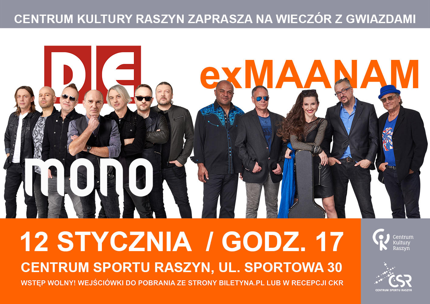 Centrum Kultury Raszyn oraz Centrum Sportu Raszyn zapraszają na koncert zespołów exMaanam i De Mono.