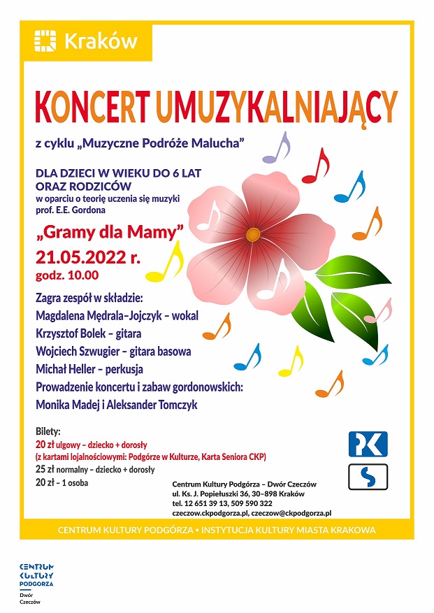 Zapraszamy na koncert umuzykalniający (gordonowski) z cyklu "Muzyczne Podróże Malucha" dla dzieci w wieku do 6 lat i ich rodziców w oparciu o teorię uczenia się muzyki prof. E.E. Gordona.