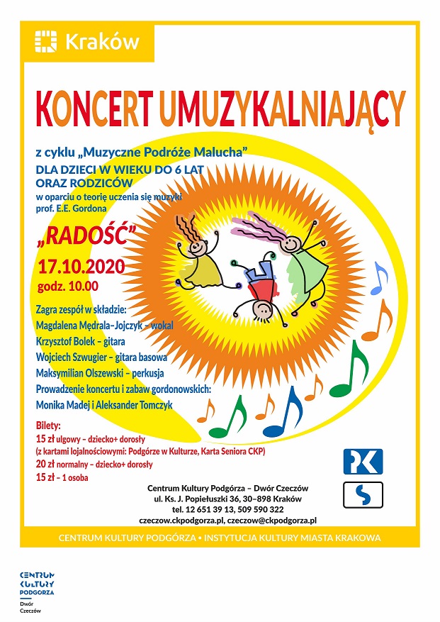 Wracamy z cyklem "Muzyczne podróże malucha" dla dzieci w wieku do 6 lat i ich rodziców! Zapraszamy na koncert gordonowski pt. "Radość", który odbędzie się 17 października o godzinie 10:00! Zagra zespół w składzie: