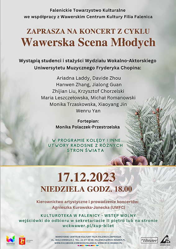 Zapraszamy na koncert z cyklu Wawerska Scena Młodych . Wystąpią studenci i stażyści Wydziału Wokalno-Aktorskiego Uniwersytetu Muzycznego Fryderyka Chopina. W programie kolędy i inne utwory radosne z różnych stron świata.