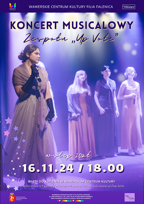 Zespół „Up Vote” zaprasza na koncert musicalowy, który przeniesie Was w świat pełen pasji, muzyki i niezapomnianych przeżyć. Przedstawimy trzy ikoniczne musicale: „The Greatest Showman”, „Hamilton” i „Rent”.W czasie koncertu usłyszymy fascynującą historię P.T.Barnuma, historię burzliwych czasów rewolucji amerykańskiej i współczesną energię i poezję życia artystów w Nowym Jorku. Każdy utwór przedstawi inny rodzaj emocji i doświadczeń, które umożliwią poruszające teksty i emocjonalną harmonię.