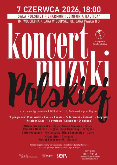 Słupska Sinfonietta zaprasza na wyjątkowy koncert, który w całości wypełni muzyka polska. Solistami pierwszej części koncertu będą dyplomanci Państwowej Szkoły Muzycznej im. Ignacego Jana Paderewskiego w Słupsku. Usłyszymy pierwszą część koncertu skrzypcowego d – moll op. 22 Henryka Wieniawskiego w wykonaniu Mai Owarzany, Romans op. 9 Emanuela Kani w wykonaniu Zofii Praszczak, i Cavatinę na trąbkę Karola Kurpińskiego w wykonaniu Weroniki Mandrosz. Wszystkie instrumentalistki są wieloletnimi członkiniami Słupskiej Sinfonietty. Na scenie pojawią się również wokalistki, które wykonają krótkie, ale niezwykle efektowne pieśni: Misza Szcześniak wykona Zaczarowaną Królewnę Władysława Żeleńskiego, Hanna Łukasiak zaśpiewa pieśń Gdy ostatnia róża zwiędła Ignacego Jana Paderewskiego, a Milena Krumplewska wykona słynne Życzenie Fryderyka Chopina. W pierwszej części orkiestrę poprowadzi student akademii muzycznej im. Ignacego Jana Paderewskiego w Poznaniu – Miłosz Otto.