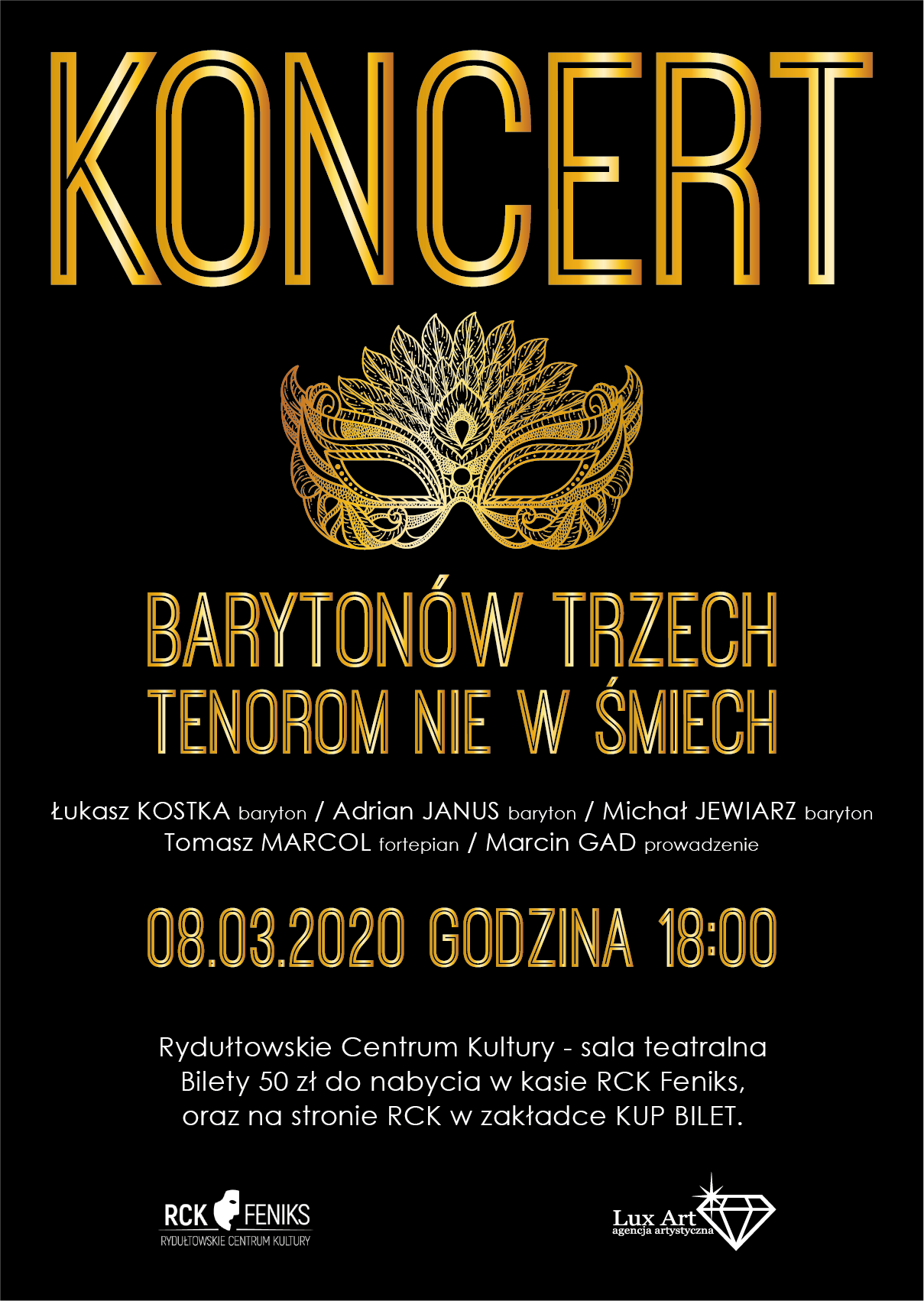 To koncert, w którym można będzie usłyszeć najpiękniejsze arie na głosy męskie, znane melodie z najsłynniejszych oper, przepięknych operetek i musicali oraz muzyki popularnej, napisane specjalnie na głosy barytonowe. Takie hity, jak: „Gdybym był Bogaty”, „Torreador”, ,,Nie ma szczęścia bez miłości’’, ,,Całuję Twoją dłoń madame’’, „Skrzypek na dachu” „My Fair Lady” piosenki z repertuaru Eugeniusza Bodo i Mieczysława Fooga oraz arie starowłoskie. Wisienką na torcie będzie istny HIT: ,,Brunetki, blondynki’’ w wykonaniu…no właśnie, to będzie niespodzianka.