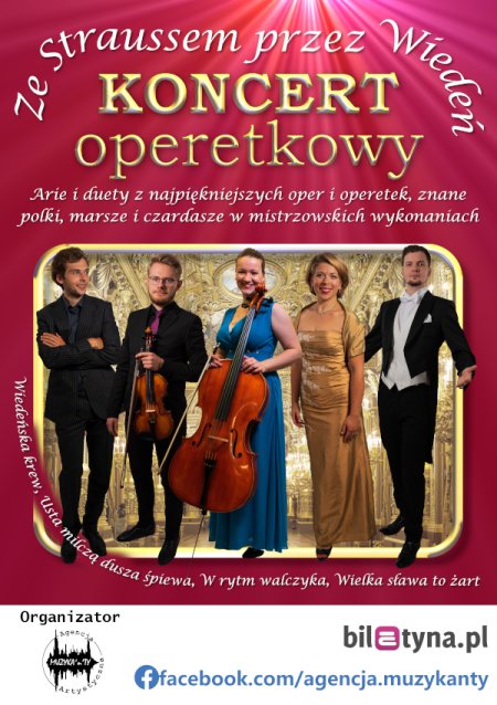 Ze Straussem przez Wiedeń to spotkanie z muzyką pełne niezapomnianych wrażeń! To także spotkanie z mistrzami opery i operetki - z Puccinim, Leharem, Kalmanem oraz królem walca - Straussem. W ten wieczór usłyszą Państwo utwory od lat bawiące całe pokolenia. W programie najbardziej znane i lubiane arie i duety, takie jak “Wielka sława to żart”, “Usta milczą, dusza śpiewa”, “W rytm walczyka” w wykonaniu utalentowanych młodych artystów - laureatów prestiżowych konkursów, koncertujących na co dzień zarówno w Polsce, jak i za granicą. W taneczny nastrój wprawią Państwa walce, polki i czardasze zagrane przez kameralny zespół instrumentalny. Nie zabraknie również wirtuozowskich popisów, jak choćby skrzypcowy “Czardasz” Montiego.