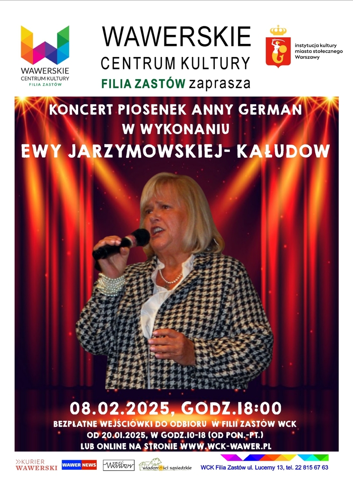 Koncert piosenek Anny German w wykonaniu wokalistki Ewy Jarzymowskiej Kałudow.