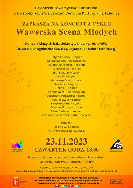 Koncert studentów Uniwersytetu Muzycznego Fryderyka Chopina w ramach Wawerskiej Sceny Młodych. Kierownictwo artystyczne i prowadzenie koncertu - Agnieszka Kurowska-Janecka.