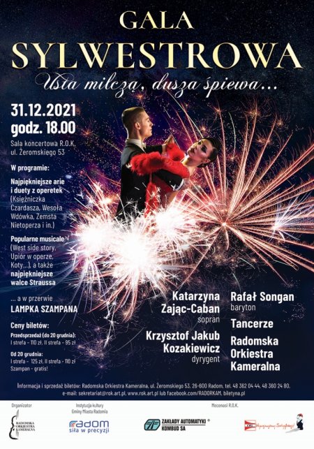 Gala Sylwestrowa w Radomskiej Orkiestrze Kameralnej to gwarancja szampańskiego nastroju i niezwykłych doznań muzycznych. W noc sylwestrową zapraszamy w niezapomnianą, sentymentalną muzyczną podróż po kontynentach i epokach, podczas której melomani zostaną wprowadzeni w doskonały, karnawałowy nastrój. W programie znajdą się najsłynniejsze przeboje operowe, operetkowe i musicalowe, które wspólnie zaśpiewają gwiazdy wieczoru. Wszystko to wraz z noworocznym kieliszkiem szampana dla swoich melomanów przygotuje Radomska Orkiestra Kameralna.
