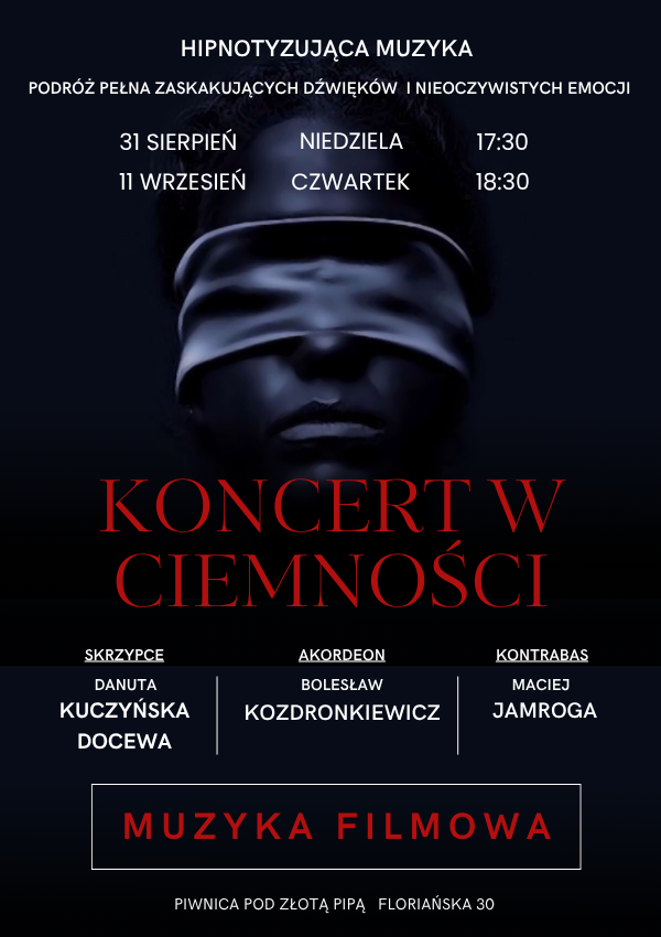 Podczas tego niezwykłego koncertu zanurzysz się w świat dźwięków w całkowitej ciemności. Na czas wydarzenia uczestnicy założą specjalne czarne opaski na oczy, które całkowicie odetną dostęp światła, pozwalając skupić się wyłącznie na muzyce.