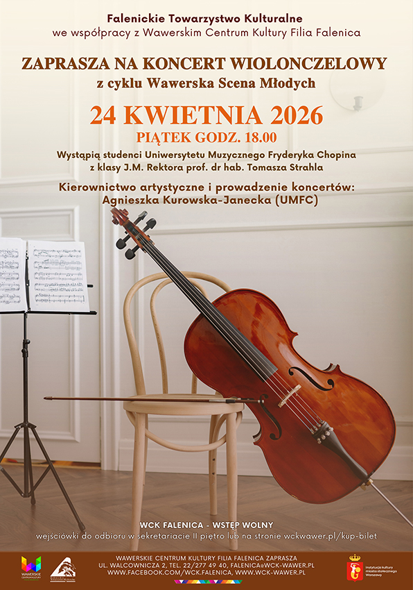 Falenickie Towarzystwo Kulturalne we współpracy z WCK Falenica serdecznie zapraszają na koncert wiolonczelowy studentów UMFC w ramach projektu: Wawerska Scena Młodych. Opieka artystyczna i prowadzenie koncertów Agnieszka Kurowska - Janecka.