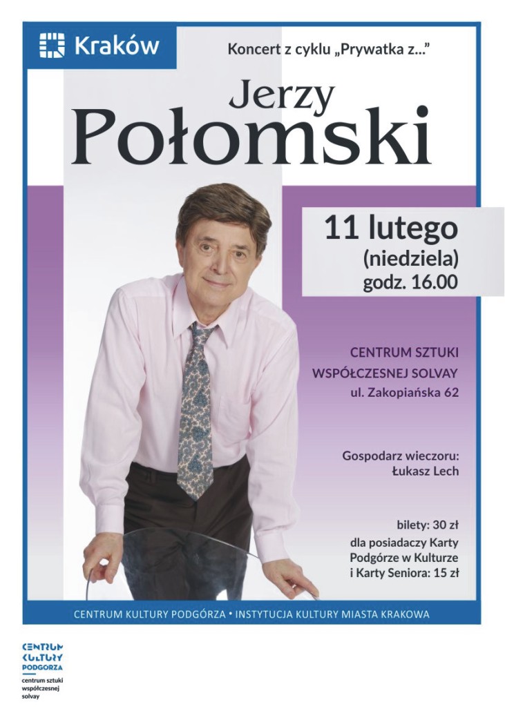 „Bo z dziewczynami” i wiele innych. Już niebawem Państwa i naszym gościem będzie Jerzy Połomski! Na prywatkę z artystą zapraszamy 11 lutego (niedziela) o godz. 16.00 do Centrum Sztuki Współczesnej Solvay (ul. Zakopiańska 62), filii Centrum Kultury Podgórza.
