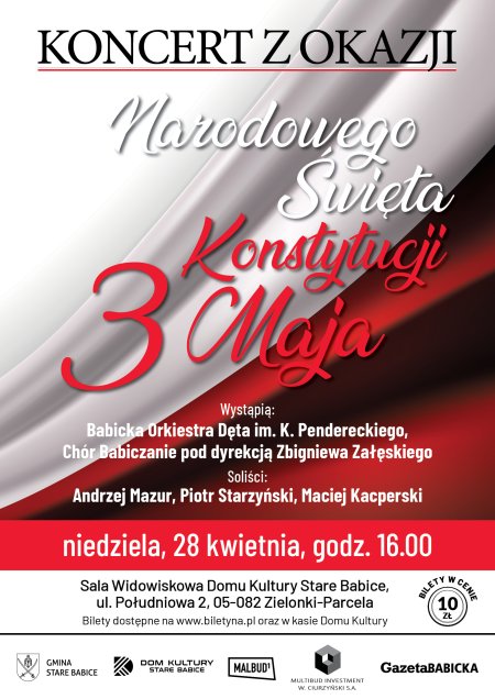Sławomir Sumka - Wójt Gminy Stare Babice oraz Janusz Czaja - Dyrektor Domu Kultury Stare Babice zapraszają na uroczysty koncert z okazji Narodowego Święta Konstytucji 3 Maja