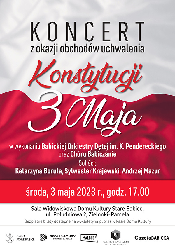 Wójt Gminy Stare Babice – Sławomir Sumka oraz Dyrektor Domu Kultury Stare Babice – Janusz Czaja serdecznie zapraszają do wysłuchania koncertu z okazji obchodów Konstytucji 3 maja 2023 r. w wykonaniu Babickiej Orkiestry Dętej im. K. Pendereckiego pod dyrekcją Zbigniewa Załęskiego oraz Chóru Babiczanie.