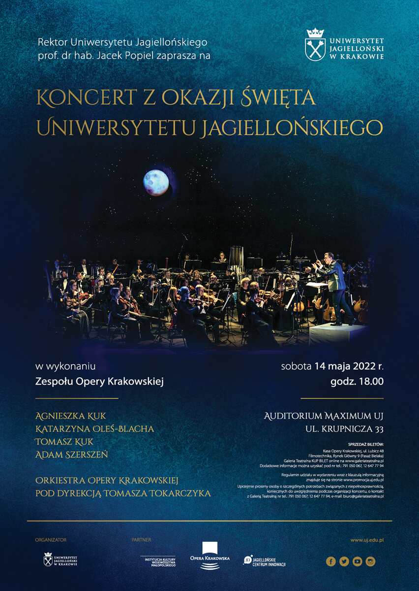 12 maja przypada 658. rocznica założenia przez króla Kazimierza Wielkiego najstarszej polskiej uczelni – Akademii Krakowskiej, dzisiejszego Uniwersytetu Jagiellońskiego; dzień ten obchodzony jest przez społeczność akademicką jako Święto UJ. W tegoroczne obchody tego święta włącza się Opera Krakowska – 14 maja podczas Koncertu Uniwersyteckiego w Auditorium Maximum wspólnie posłuchamy wyśmienitej muzyki operowej i operetkowej. A wszystko to w wykonaniu Solistów: Agnieszki Kuk (sopran), Katarzyny Oleś-Blacha (sopran), Tomasza Kuka (tenor) i Adama Szerszenia (baryton) oraz Orkiestry pod dyrekcją Tomasza Tokarczyka.