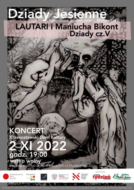 Dnia 2 listopada 2022 r. o godz. 19.00 Krasnostawski Dom Kultury zaprasza do sali widowiskowej na koncert zespołu Lautari oraz Maniuchy Bikont pt. „Dziady część V”.