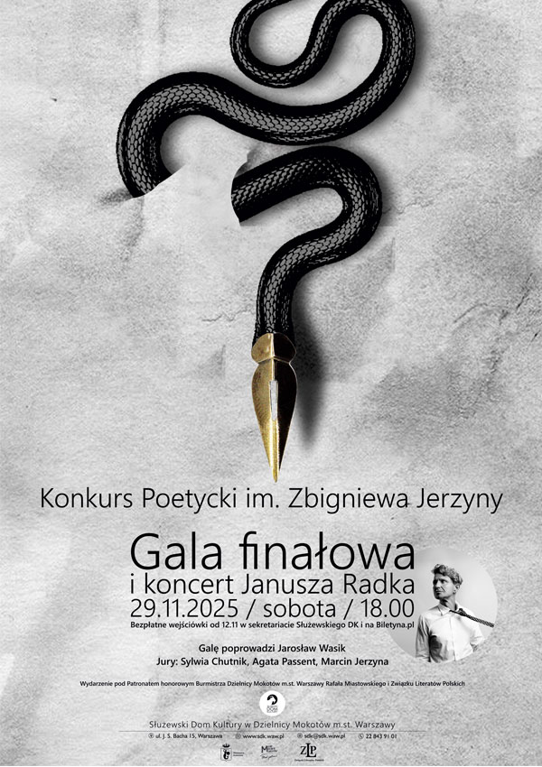Po raz piąty zapraszamy do wspólnego tworzenia przestrzeni dla poezji – świeżej, poruszającej, odważnej. Konkurs Poetycki im. Zbigniewa Jerzyny to inicjatywa, która nie tylko promuje literackie debiuty i wspiera twórczość początkujących poetek i poetów, ale również pielęgnuje pamięć o jednej z wyrazistych postaci polskiej poezji XX wieku.