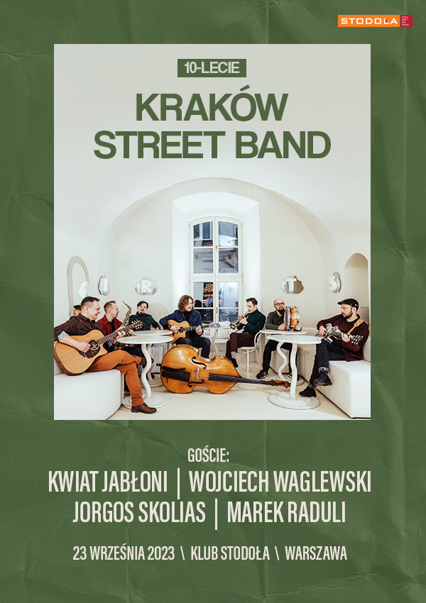 Po spektakularnym sukcesie koncertu z okazji 10-lecia w rodzinnym Krakowie, Kraków Street Band ogłasza kolejne muzyczne przedsięwzięcie. W odpowiedzi na ogromne zainteresowanie fanów, zespół wystąpi z tym samym programem również w stolicy! Warszawski koncert, z udziałem wyjątkowych gości specjalnych, odbędzie się 23 września 2023 w Klubie Stodoła. Na scenie do KSB dołączą: Wojtek Waglewski, Kwiat Jabłoni, Marek Raduli i Jorgos Skolias. Zabrzmią zarówno utwory znane z energicznych koncertów formacji jak i nowe aranżacje piosenek zaproszonych gości. Bilety dostępne w sprzedaży!
