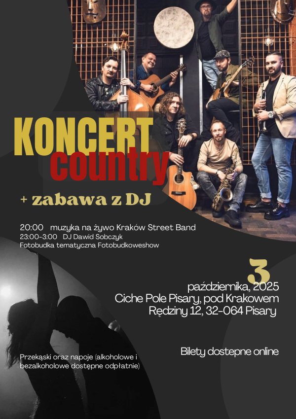 W plenerowym miejscu pod Krakowem zapraszamy wszystkich fanów muzyki na żywo, dźwięków country i zabawy w otoczeniu przyrody. Wydarzenie rozpocznie się koncertem krakowskiego zespołu Kraków Street Band, a zakończy zabawą z DJ'em Dawidem Sobczykiem. Ponadto dla gości dostępna będzie fotobudka oraz osobny bar z napojami i przekąskami.